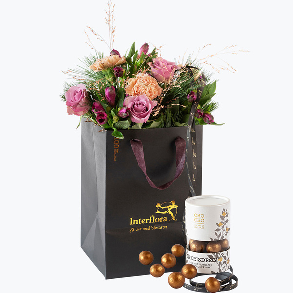 Nydelig frodig bukett med ulike blomster i delikate lilla/fersken nyanser med blant annet roser , alstromeria florlette strå og vakkert grønt. Din blomsterhilsen leveres på døren i vår eksklusive gavepose sammen med deilige lakris kuler med smak av salt lakris og hvit sjokolade. og vil garantert glede den heldige mottakeren.